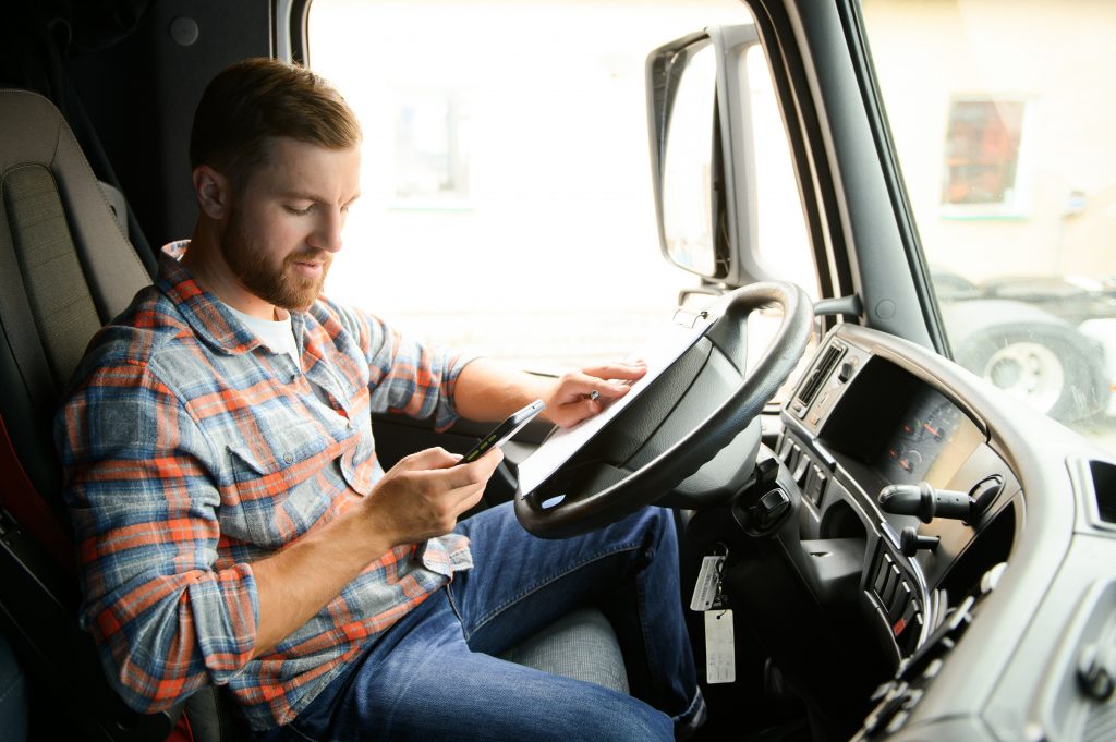 forwarder driver sits behind the wheel of a car and examines documentation for the cargo