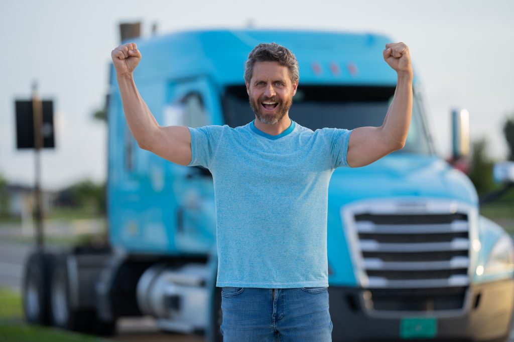 Men driver near lorry truck. Truck driver. Trucking owner. Transportation vehicles. Handsome man posing in front of truck. Semi trucks vehicle